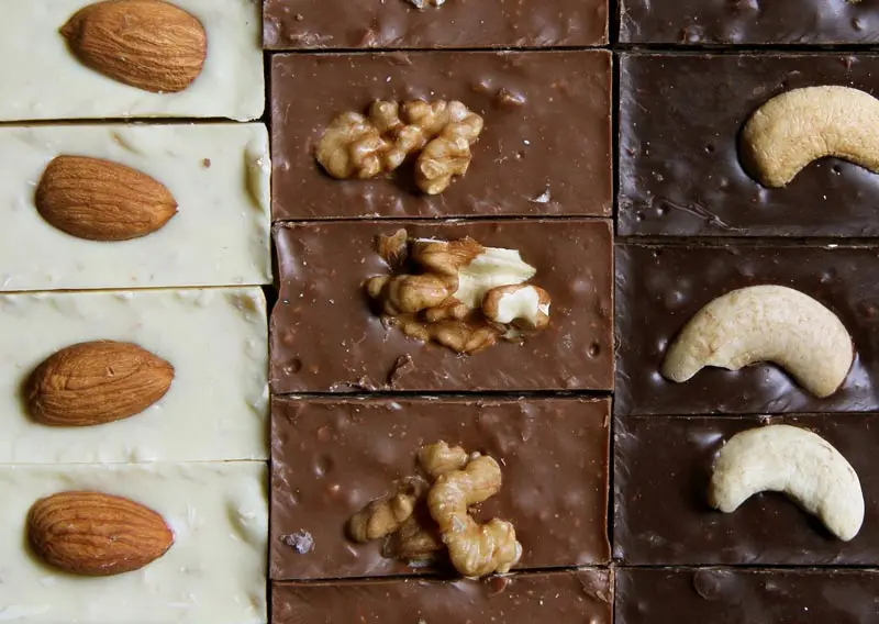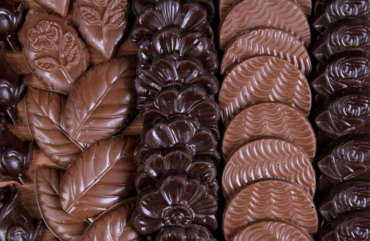 Medallones pequeños de chocolate sólido, hechos a mano con variadas formas, con agregados de frutos secos (avellanas, almendras, castañas, manies); arroz crocante; copos de maiz crocantes; coco; uvas al licor; marroc. Variedades en base a chocolate con leche, semiamargo o blanco.