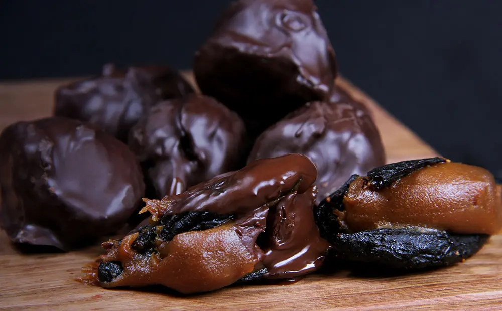 Ciruelas bombón: rellenas c/dulce de leche y nueces y cubiertas con chocolate s/a.