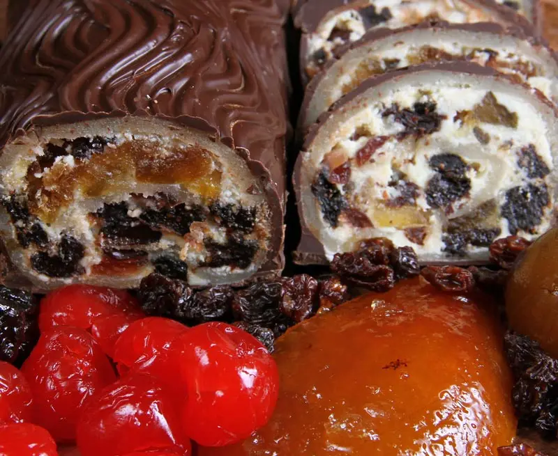 Chocolates caseros: bloquecitos tiernos a la naranja; al café; al cognac; con uvas al licor; de almendras.